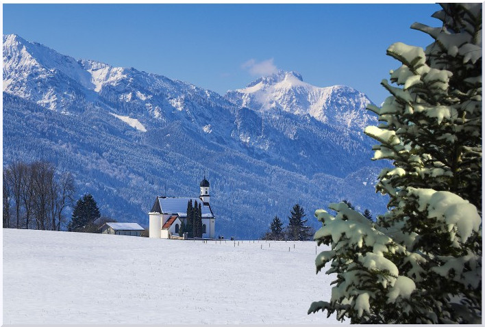 Am Nordrand der Alpen, auf einem vorgelagerten Bergrücken, steht die Kapelle St. Peter in Berghof. Nach Südost breitet sich das Ammergebirge aus, nach Südwest die Tannheimer Berge. Der erste Kirchenbau an dieser Stelle wird 1429 erwähnt. Die Kapelle in der heutigen Form wurde 1685 in barockem Stil erbaut. |