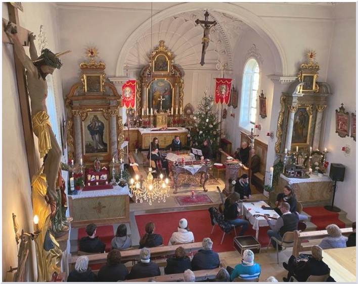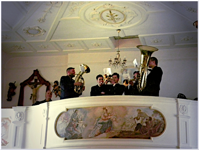 Die Bläsergruppe der Musikkapelle Buching spielt auf der Empore weihnachtliche Weisen. |